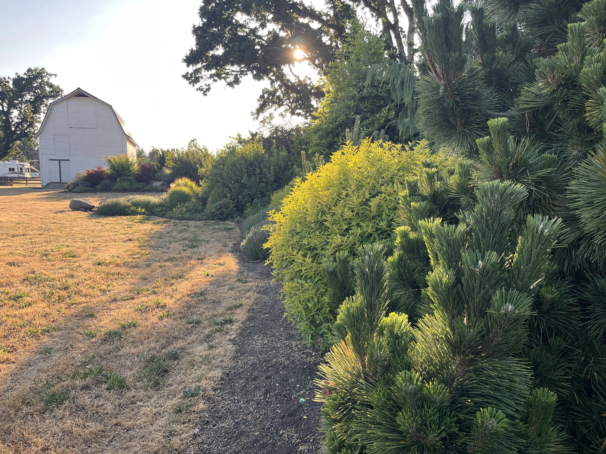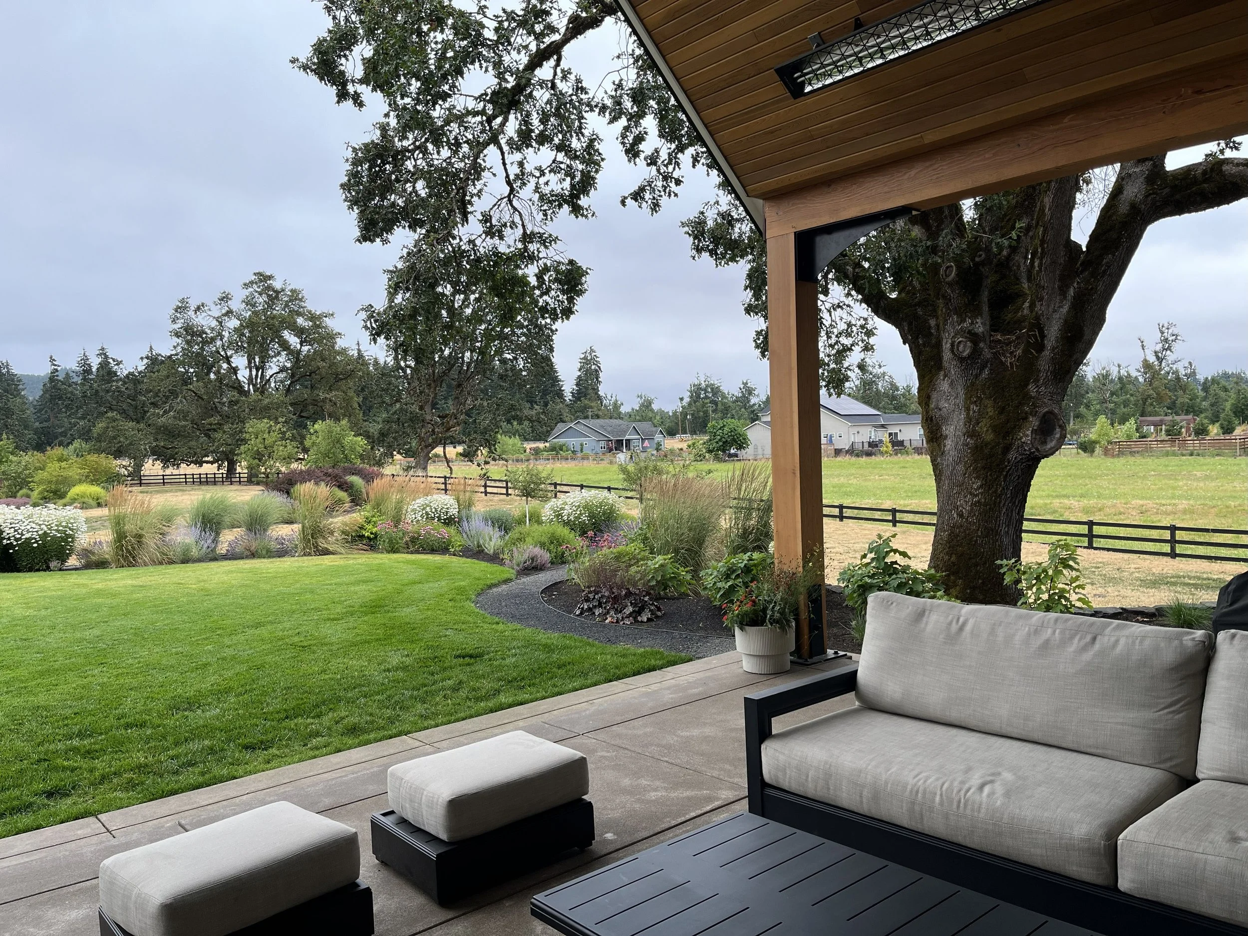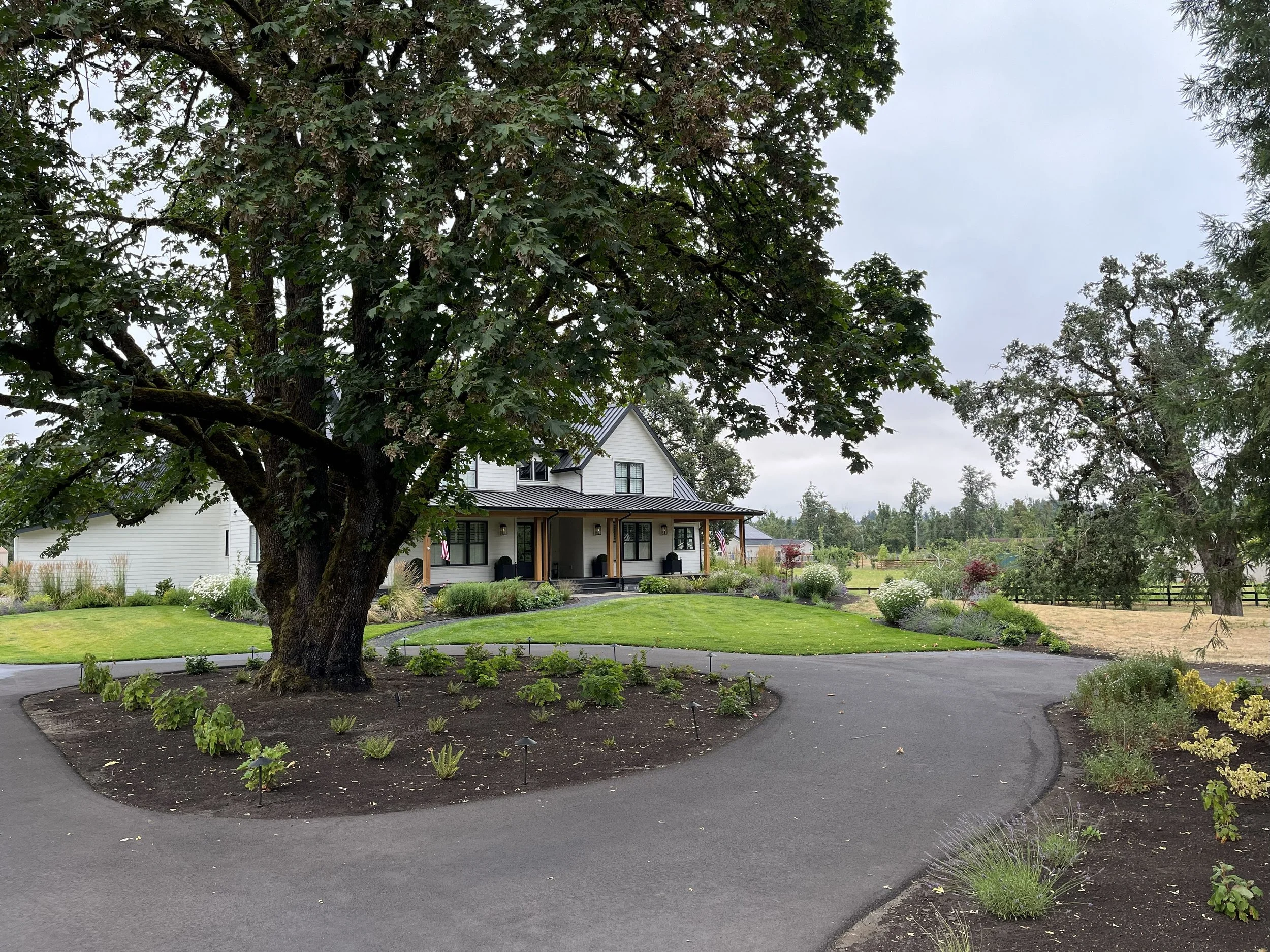 With the landscape leading the way, attention to the fine details that support a functional and fun living space, such as studies for the turning radius of a circle driveway, collaboration with a putting green expert, and design of an outdoor living area, were considered. As landscape led architecture, this project was designed to fit in with the rural agricultural setting in the modern farmhouse style. In response to the clients’ request for privacy from a nearby industrial space, we formed strategically placed berms and curated a plant palette of reliable and resilient plants that could withstand the steady wind exposure and low water access.