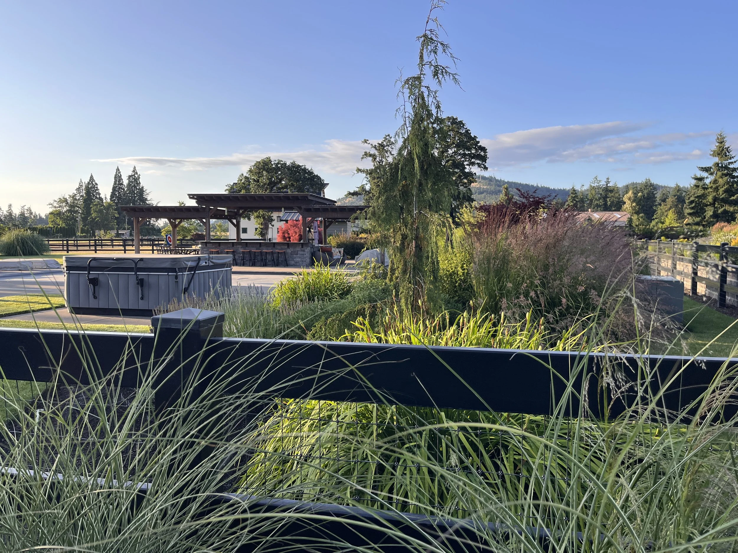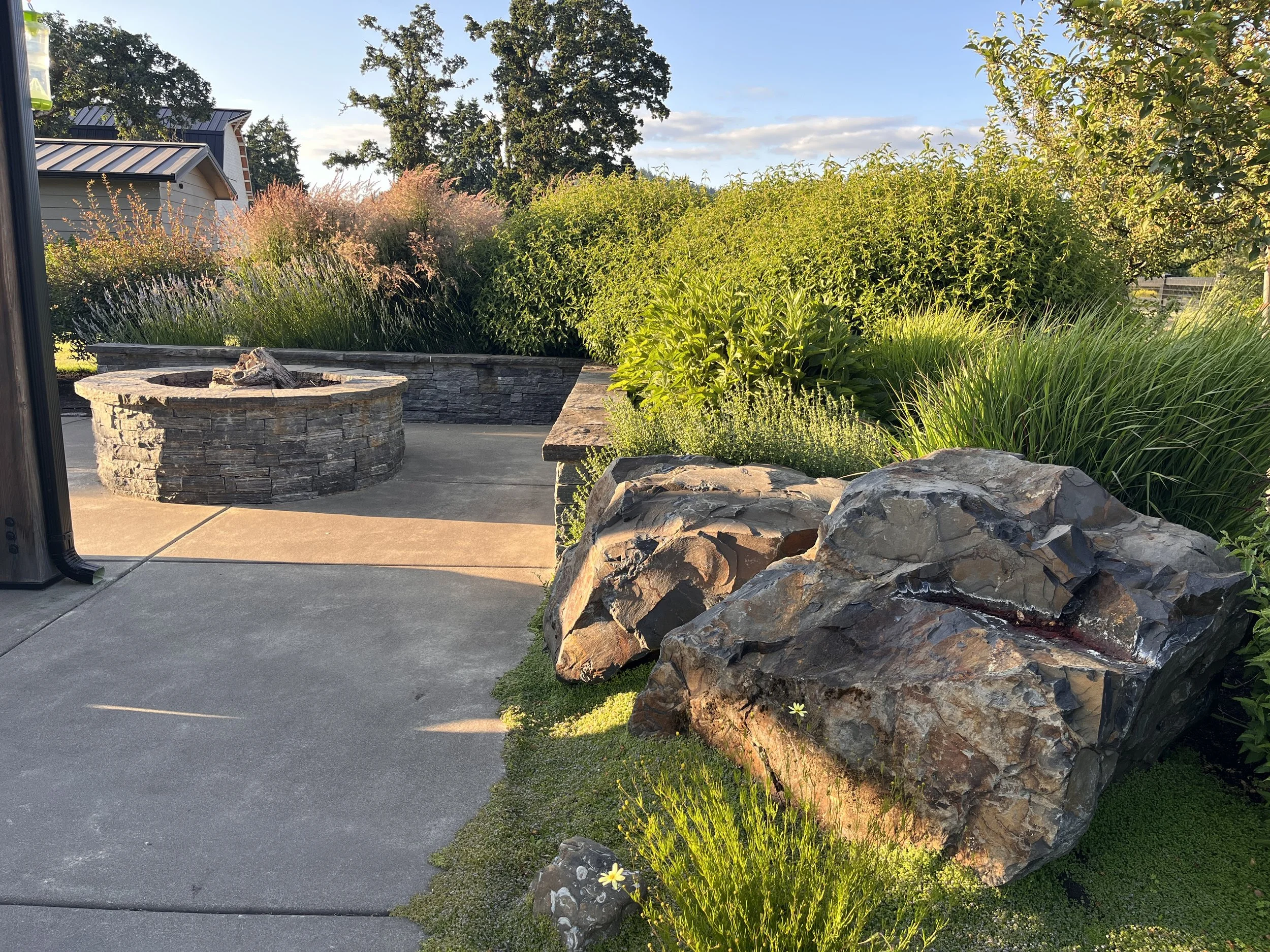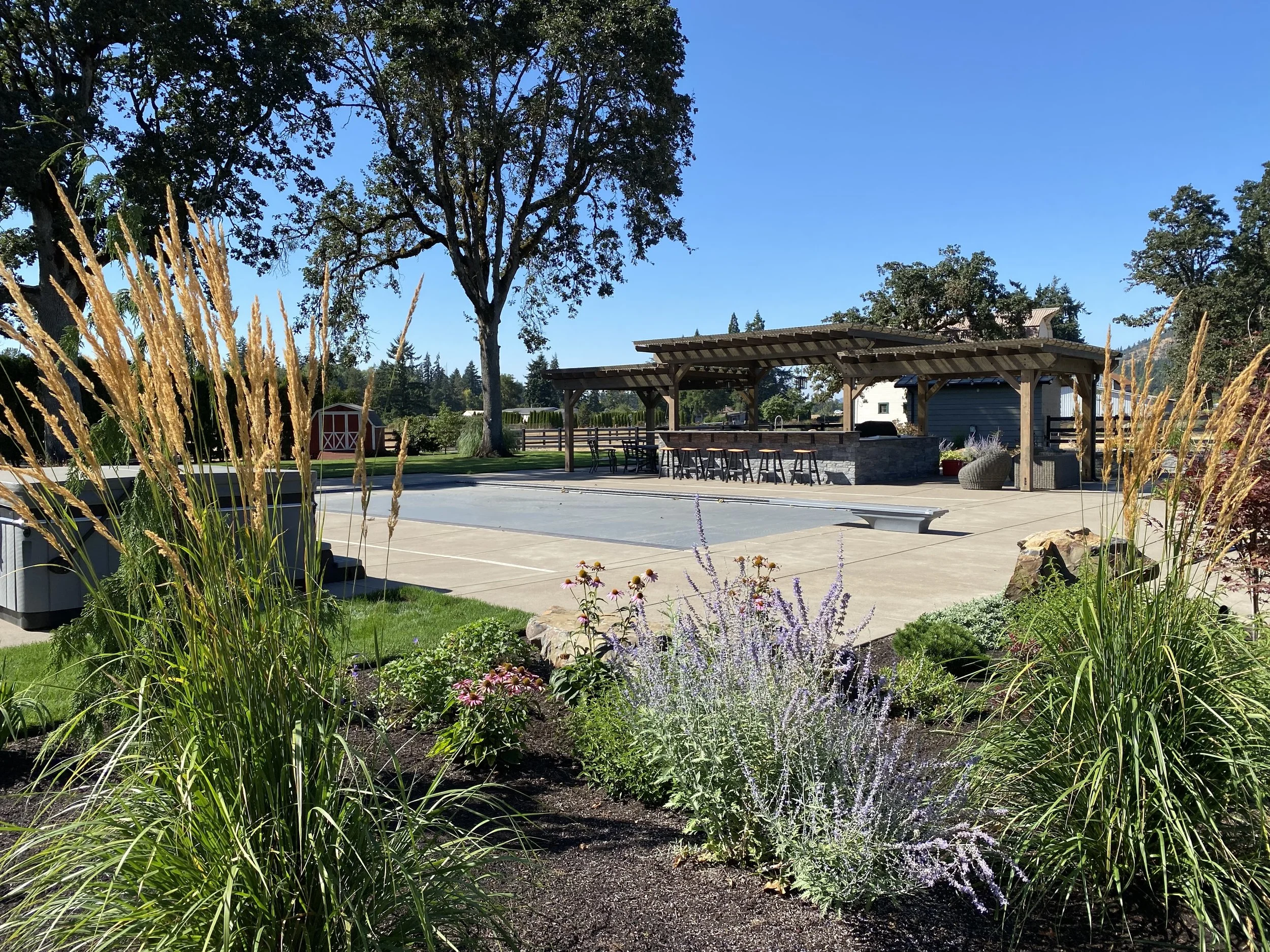 The client wished to create a more welcoming space to host family gatherings, game nights, and dinners. The existing outdated kidney shaped pool surrounded by a chain link fence provided too little patio space and too little flow to the greater views. With our pool expertise, we were able to help the clients better envision what was possible. An open yet cozy outdoor kitchen and living room was situated adjacent to the pool, which then offered opportunities to cook, relax, and play close to one another while still honoring the expansive landscape that surrounded the home. The thoughtful plantings not only offer color, texture, and vibrancy to the built space, they also assist in creating screened privacy from adjacent properties.